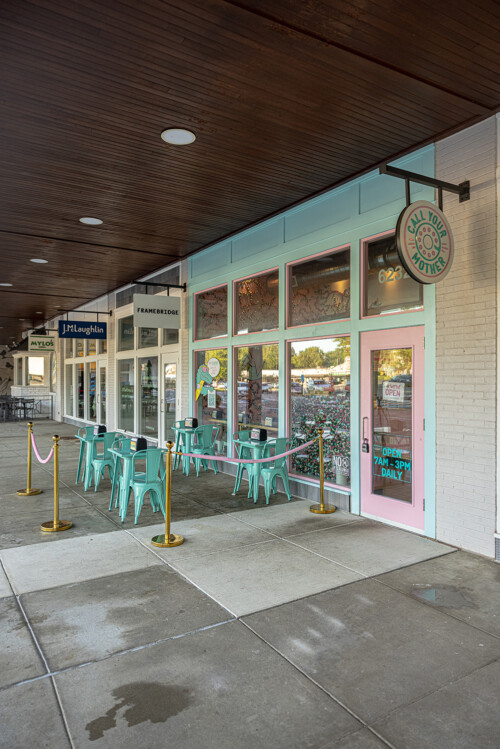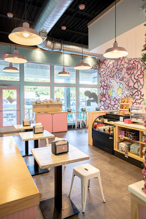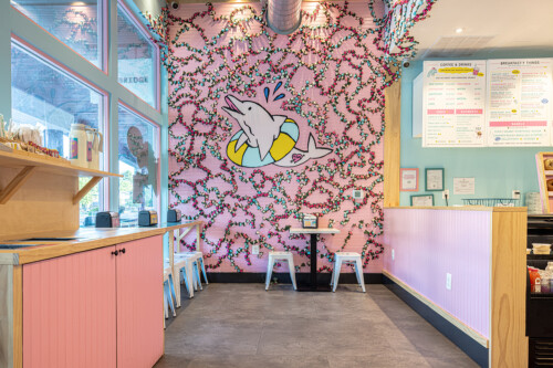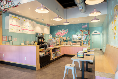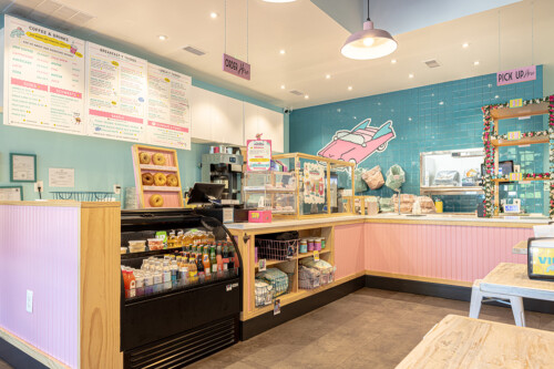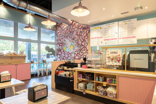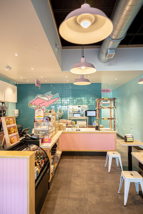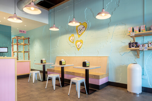 The location, formerly home to Cold Stone Creamery, has been completely transformed. True to their style, the Call Your Mother Deli and Hospitality Construction Services teams collaborated to create a space as distinctive as the brand itself. Bold colors and gleaming tiles, later featured in other deli locations, set the stage, while walls come alive with playful murals of cars, dogs, and other whimsical elements that capture the eye and spark conversation. Plaster walls were intentionally chipped away to add texture before being painted in a bright, energetic color palette, creating a tactile, inviting environment that embodies the deli’s irreverent charm.