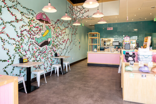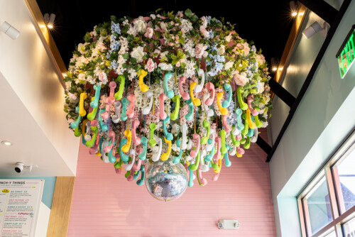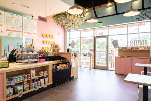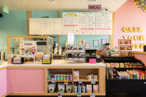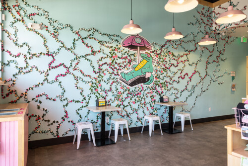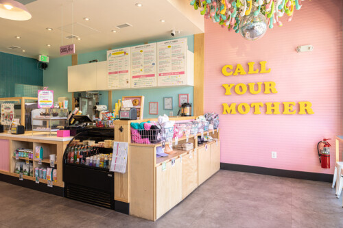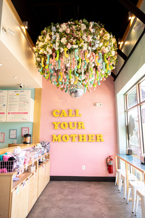 Their latest location, formerly home to another Cold Stone Creamery, has been completely reimagined. In true style, the Call Your Mother Deli and Hospitality Construction Services teams created a space as unique as the brand itself. The solid existing structure provided a great foundation, while updated electrical, fresh paint, new floors, and a burst of bold colors brought the deli’s signature quirkiness to life. The showstopping centerpiece—a whimsical 6-by-8-foot spinning chandelier complete with a disco ball—sets the tone the moment you walk in. The deli officially opened in mid-October 2024, drawing enthusiastic crowds.