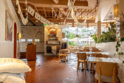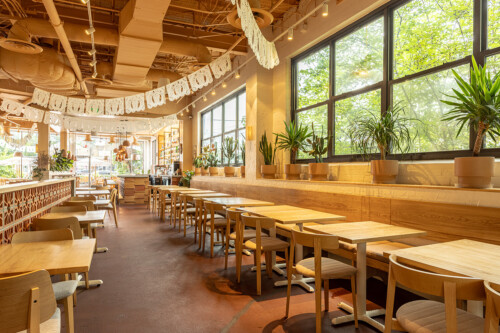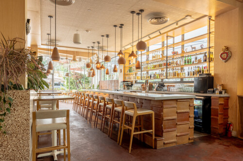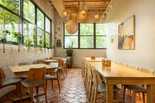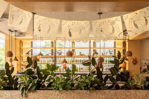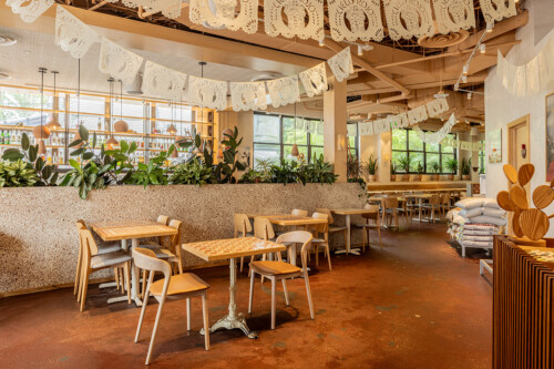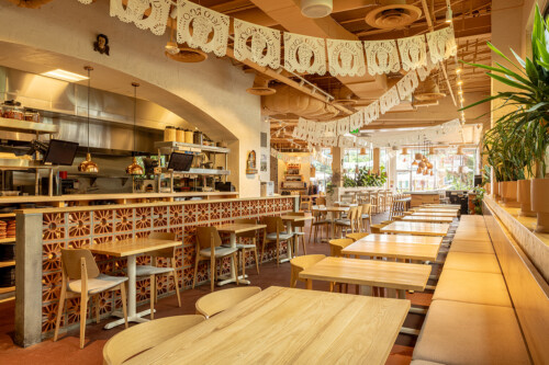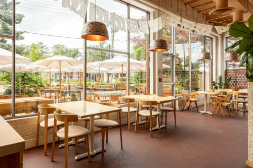 Incorporated into the design were traditional Mexican tiles, warm woods, a copper bar, and curated artwork and photography from local artists. Terracotta finishes, fabric lamps, and specialized plaster work further enhance the restaurant’s authentic, artisanal aesthetic. The outdoor area features large umbrellas for shade, lush greenery, and carefully selected potted plants, creating a comfortable and vibrant dining environment.