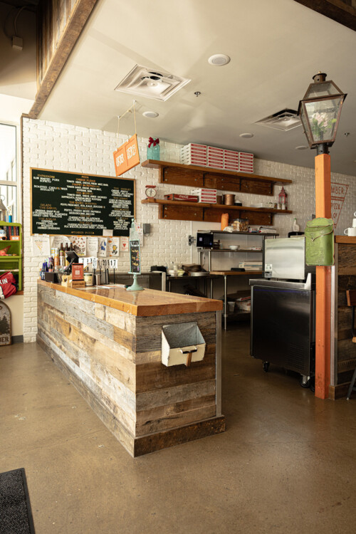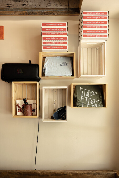 Working closely with Timber co-owner Andrew Dana (also known for Call Your Mother Deli), the team hand-selected reclaimed wood and vintage millwork from antique shops. Even old workbenches found new life as counters and service stations, reinforcing the space’s authentic design language. The focal point is the wood-fired oven from Maine Wood Heat, topped with a glowing copper crown that commands the room and anchors the entire experience.